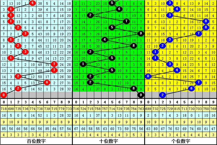 百位走势:近10期在1-7之间出号,跨度为7点,出号比较分散,上期奖号为2,下降4点,本期预计该位走小。另外近10期该位大小比为3:7,小 号大热,本期小 号再出,关注号码0。